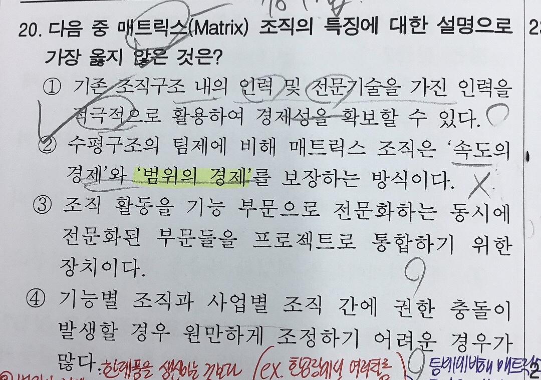 2번 선지에 범위의 경제란 기업이 한 제품보다 여러 제품을 함께 생산하는 결합방식을 채택할 때 비용이 절감되는 현상을 말한다고 하는데 이게 왜 팀제에는 해당되지 않고 매트릭스 조직에만 해당되는 건가요? 팀제는 여러개의 산출이 아니라 하나의(?) 산출이고, 매트릭스 조직은 기능+사업부제니까 여러개의 산출이 나온다는 뜻일까요,,? 도와주세요..