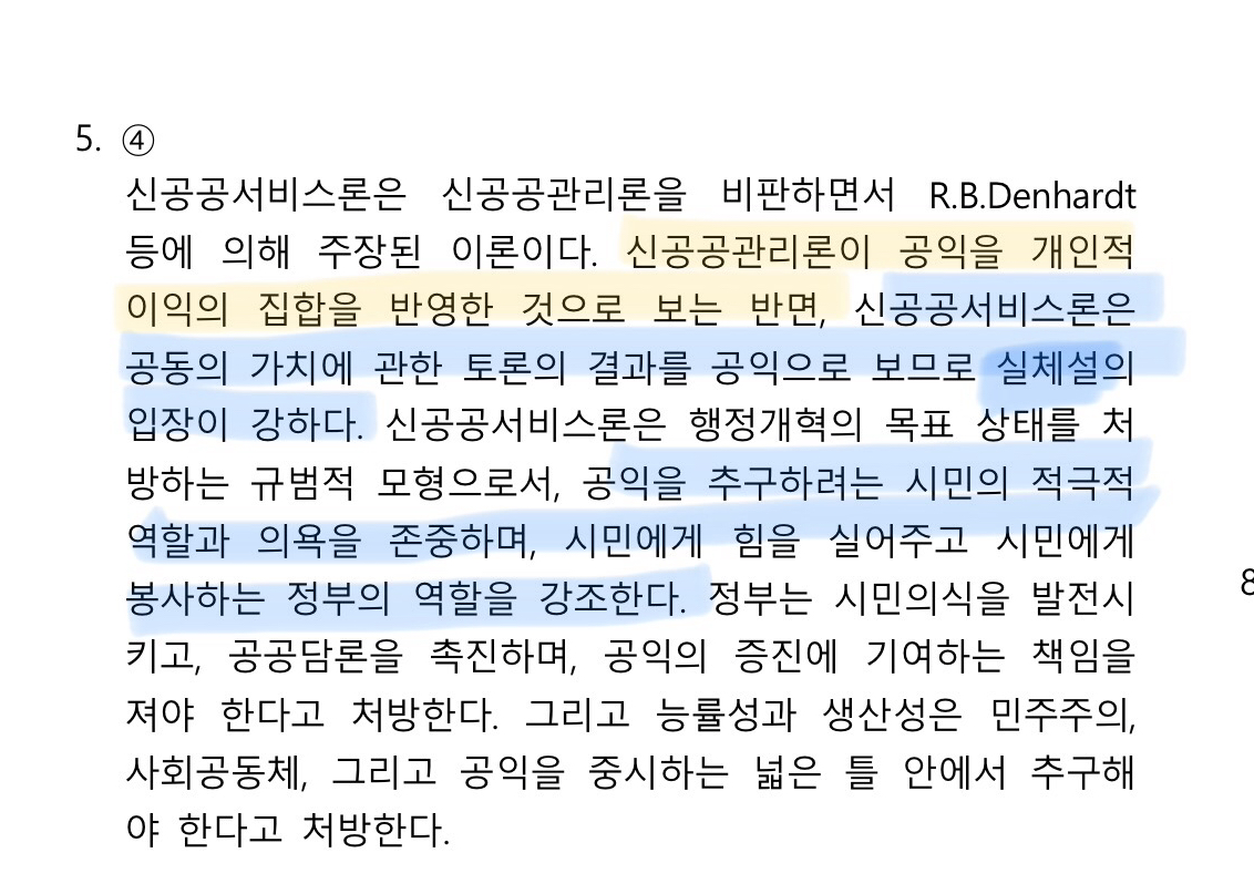 안녕하세요~! 신공공서비스가 공익 실체설과 관련이 있나요??? 담론을 통한 공익의 중시->공익 과정설인거 같은데 답지에는 신공공서비스가 실체설과 가깝다고 되어있어서요.. 압축 데일리4 5번 문제입니다 해설지 첨부했어요,!!