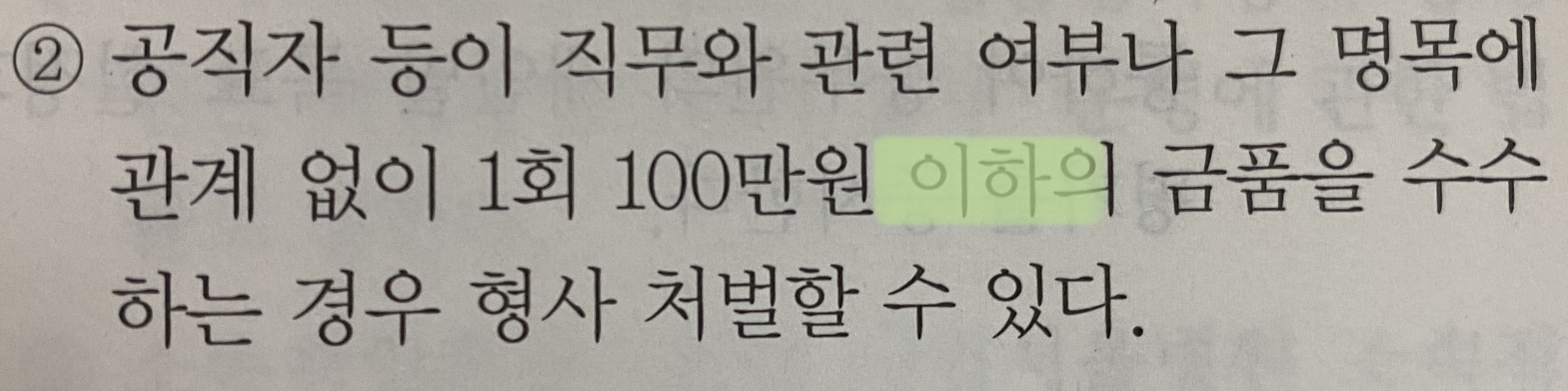 1번째 사진에 100만원 '이하' 수수하면 처벌될 수 있다는 게 맞는 지문인데 2번째 사진 해설 보면 '이하'가 아니라 '초과'입니다. 다른 거 아닌가요 ㅜ
