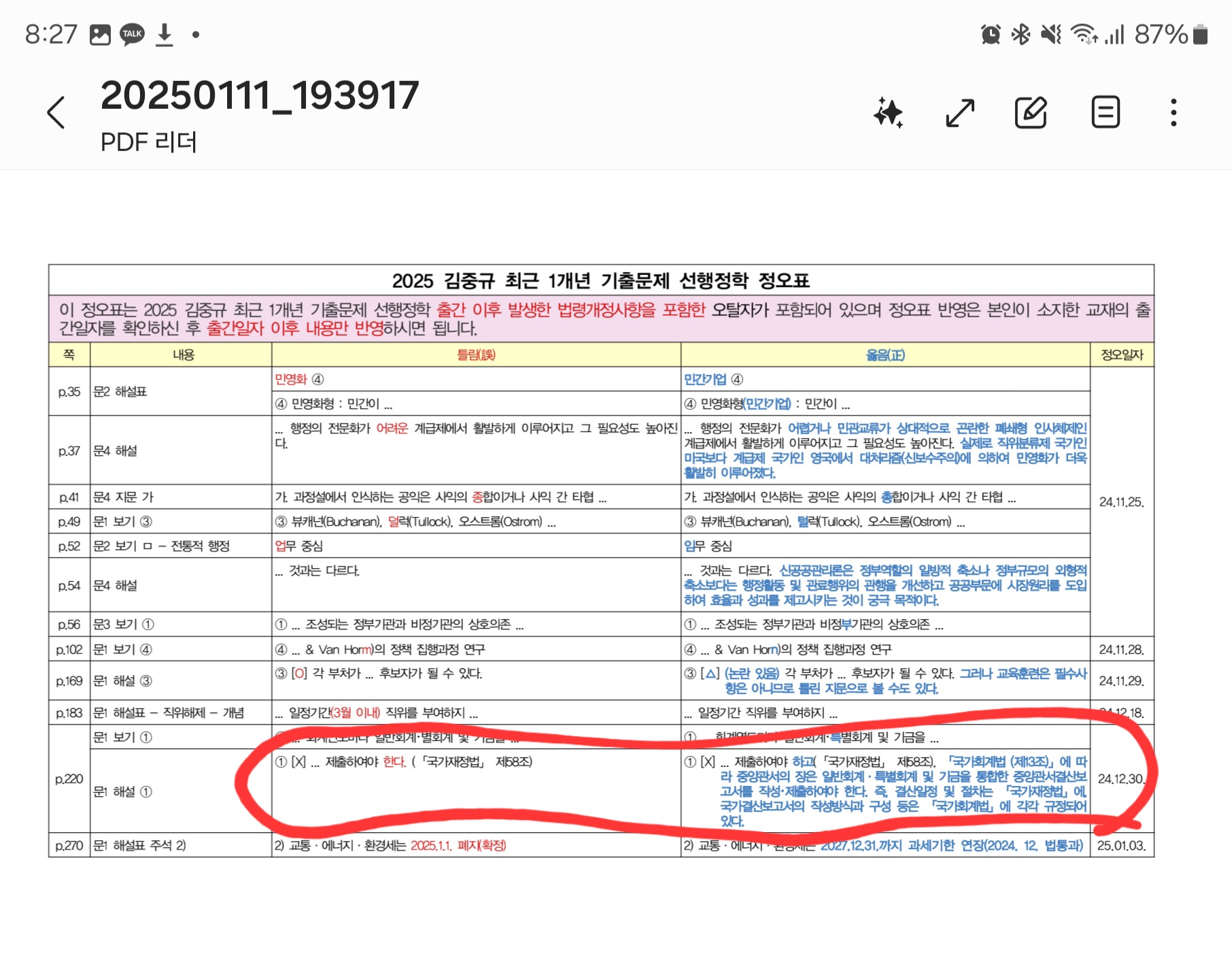 수고하십니다. 주로 교수님이 아닌 연구원? 님이 답변다는것 같은데요. 정오표 올라온거 보고 답답해서 질의 드립니다. 1년 개출 220쪽 1번, 군무원 기출, 결산 절차. 정오표에 올라온 해설 보면,. 선지에서 어떤 부분이 틀렸기에 지문이 틀린 지문인지 명확한 설명없이 재정법 회계법만 장황하게 적어놓았습니다. 문제 해설은, 해당 선지가 왜 틀린 선지인지, 전체 선지는 살리면서 (최소한의 부분만) 어느 부분을 어떻게 고치면 맞는 선지가 되는지를 먼저 설명해주고, 그 다음 필요에 따라 보충설명을 해주면 좋을텐데요. 정오표 내용이 오히려 핵심없이 장황하게 돠어 있어서 답답하네요. 1번, 2번, 3번 선지 내용 흐름상, 굳이 선지에도 없는 2월말일 제출 등 설명하면서, 결산일정, 작성방식 나눠서 국가재정법과 회계법에 각 규정되어 있다고 복잡하게 설명이 필요한가여? 간단히 말하면, 1번 지문은 "국무총리"를 '기재부장관'으로 바꾸면 맞는 선지가 되는거 아닙니까?