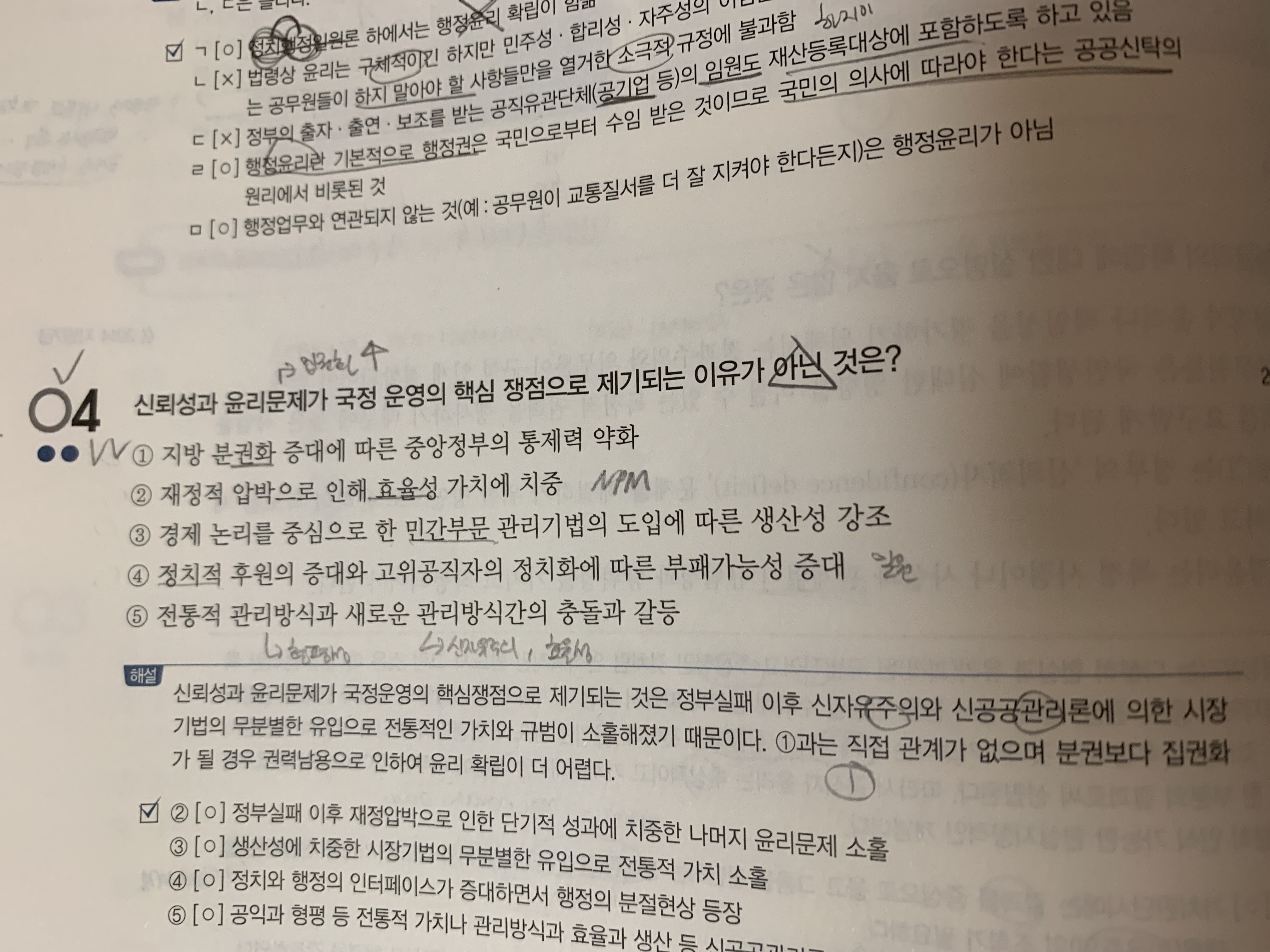 문제의 핵심은 윤리문제가 발생한다, 발생하지 않는다가 아니라, 신뢰성과 윤리문제가 국정 운영의 핵심 쟁점으로 제기되는 이유입니다. 해설에 나와 있듯이 지방 분권화는 신뢰성과 윤리문제가 국정 운영의 핵심 쟁점으로 제기되는 것과 직접적인 연관이 없습니다. 또한 물론 중앙에서 지방에 대한 통제가 아예 안 된다면 그것도 문제가 있겠지만, 상대적으로 분권화되면서 생기는 문제보다는 지나친 집권화로 인한 권력 남용에서 비롯되는 윤리문제가 더 해악이 될 수 있음을 지적한 것입니다.