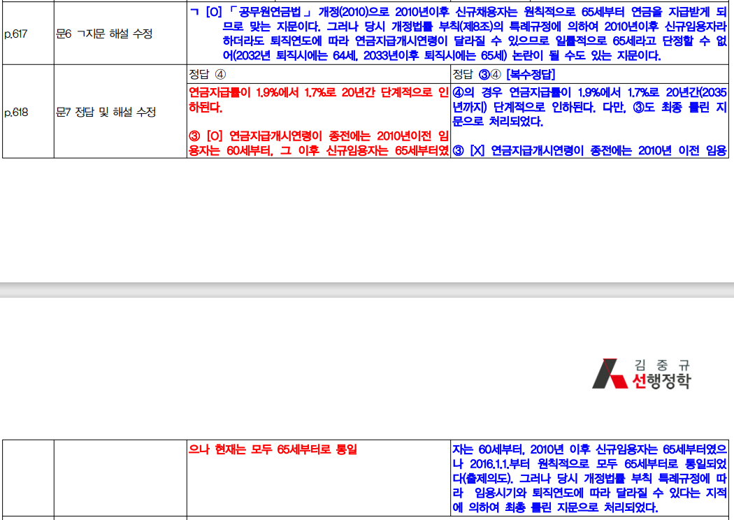 **파일첨부해드렸습니다 정오표보면 기출 617쪽 6번문제 ㄱ은 65세로 늦춰졌으나 퇴직연도에 따라 연금이 달라질수있으므로 일률적으로 65세라고 단정 지을 수 없으나 퇴직연금 수혜개시 연령이 65세인 것이 옳은 지문이고 618쪽은 7번문제 선지 3번은 연금지급개시 연령을 65세로 한다가 최종적으로 틀린지문으로 3,4번 복수정답이라고 돼있는데... 어떻게 이해해야되나요?..