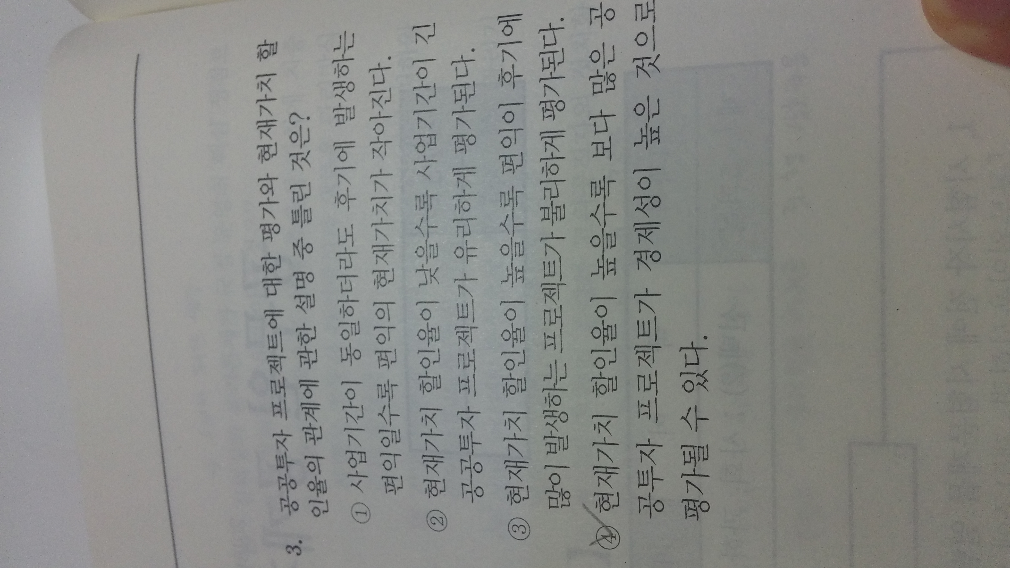 1. All pass 선행정학 모의고사 13회 3번 문제입니다 2번 3번 지문 질문입니다. 지문이 이해가 잘 안 가서 그러는데 설명 부탁드립니다. 그리고 반대도 성립인가요? 그러니까 2번은 할인율이 높을수록 사업기간이 짧은 공공투자 프로젝트가 불리하게 평가되고 3번은 할인율이 낮을수록 편익이 후기에 많이 발생하는 프로젝트가 유리하게 평가되나요? ※사진이 이상하게 올라가는데 수정이 안 되네요ㅜ 2. 매트릭스조직 질문인데요 매트릭스조직은 기능조직과 사업조직이 나눠져 있어서 조정이 쉽지 않잖아요? 그럼 일반적으로 '비용이 많이 든다'는 지문은 맞다고 봐야하나요?