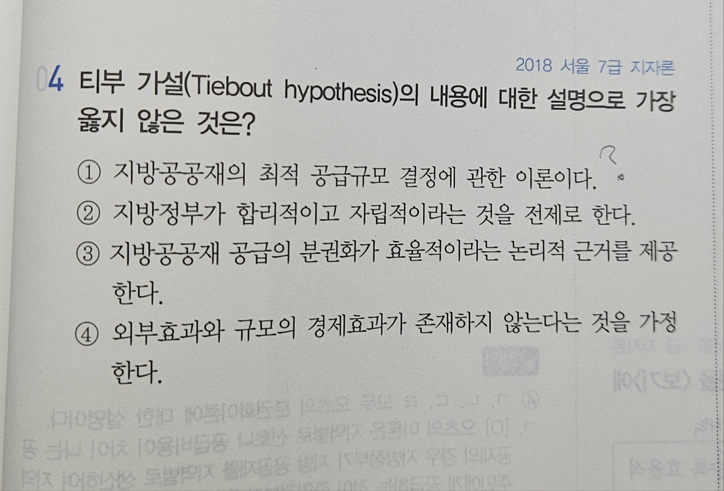 1. 종전에 질문드렸던 티부가설의 추가 질문드립니다. 위의 문제에서 답이 1번인데, 1번이 왜 틀린 건지 잘 모르겠습니다ㅠㅠ 해설에는 티부가설은 최적규모가 아닌, 지방공공재의 효율적 공급이론이라고 나오는데 이해가 되지 않습니다..